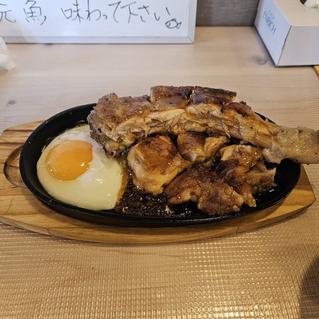 鉄板はジュージューと音を立てて、皮はパリパリでジューシーなとり焼きを楽しむことができます。